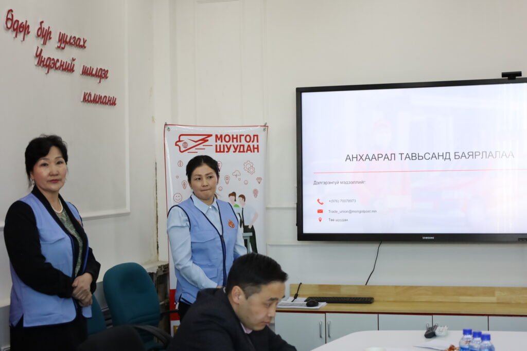Салбарын ҮЭ-үүдийн холбооны 2024 оны үйл ажиллагааны төлөвлөгөөний хүрээнд Салбарын гишүүн ҮЭ-ийн хороодоос ажлаараа “Шилдэг гишүүн байгууллага ”-аар шалгарсан “Монгол шуудан” ХК-ийн Шуудангийн ажилтны ҮЭ-ийн хорооны үйл ажиллагаатай танилцах, ҮЭ-ийн хороодын үйл ажиллагааг идэвхжүүлэх зорилгоор туршлага солилцох уулзалтыг “Монгол шуудан” ХК-ийн төв салбарт зохион байгууллаа.